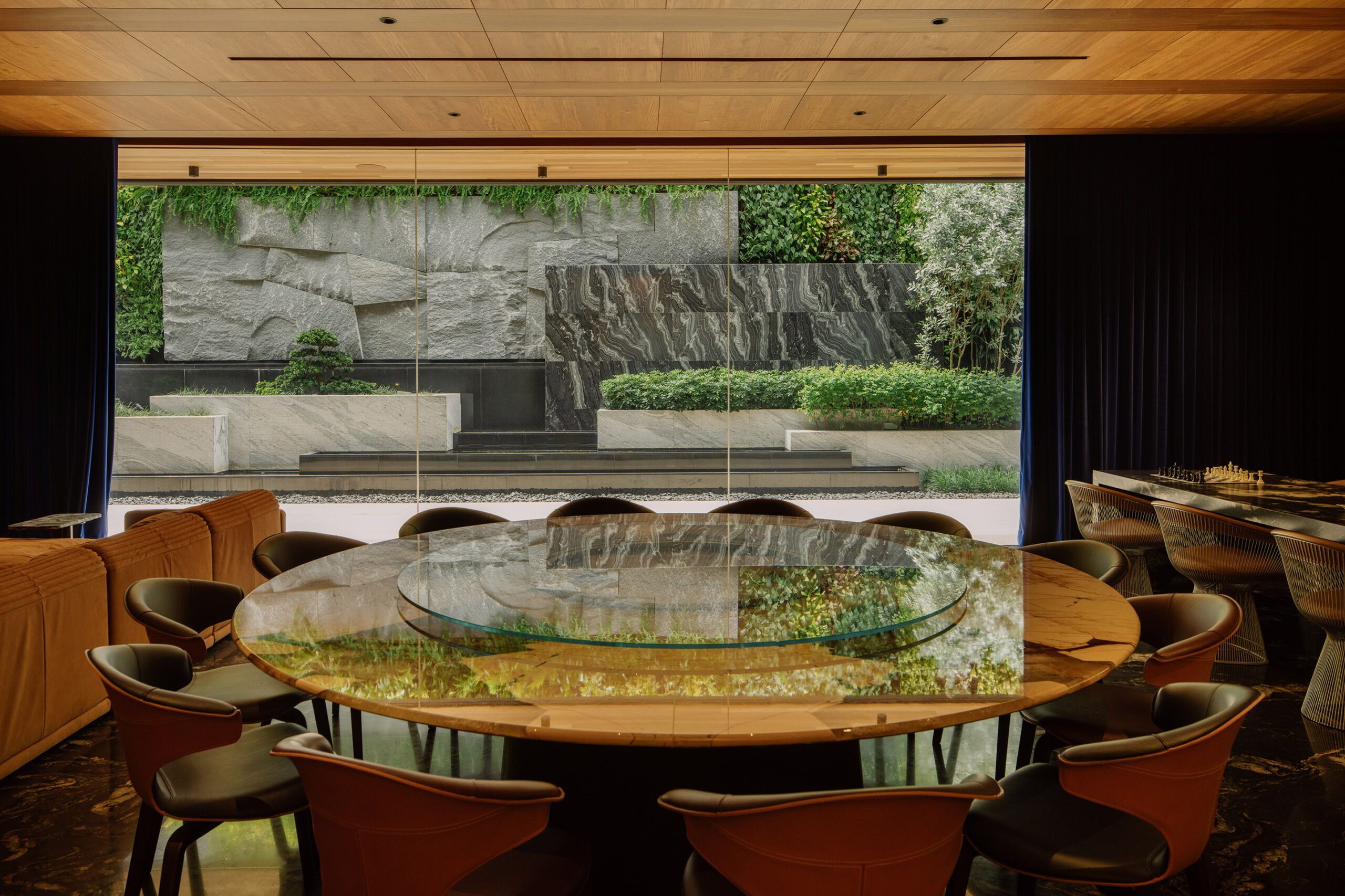 The ground-floor living room opens directly toward the central courtyard, embracing the pool and greenery as part of the everyday living experience. Connected via two hidden doors, the generous dining spaces are set to enjoy views of the rear landscape, allowing meals to unfold against a serene, sculpted backdrop.