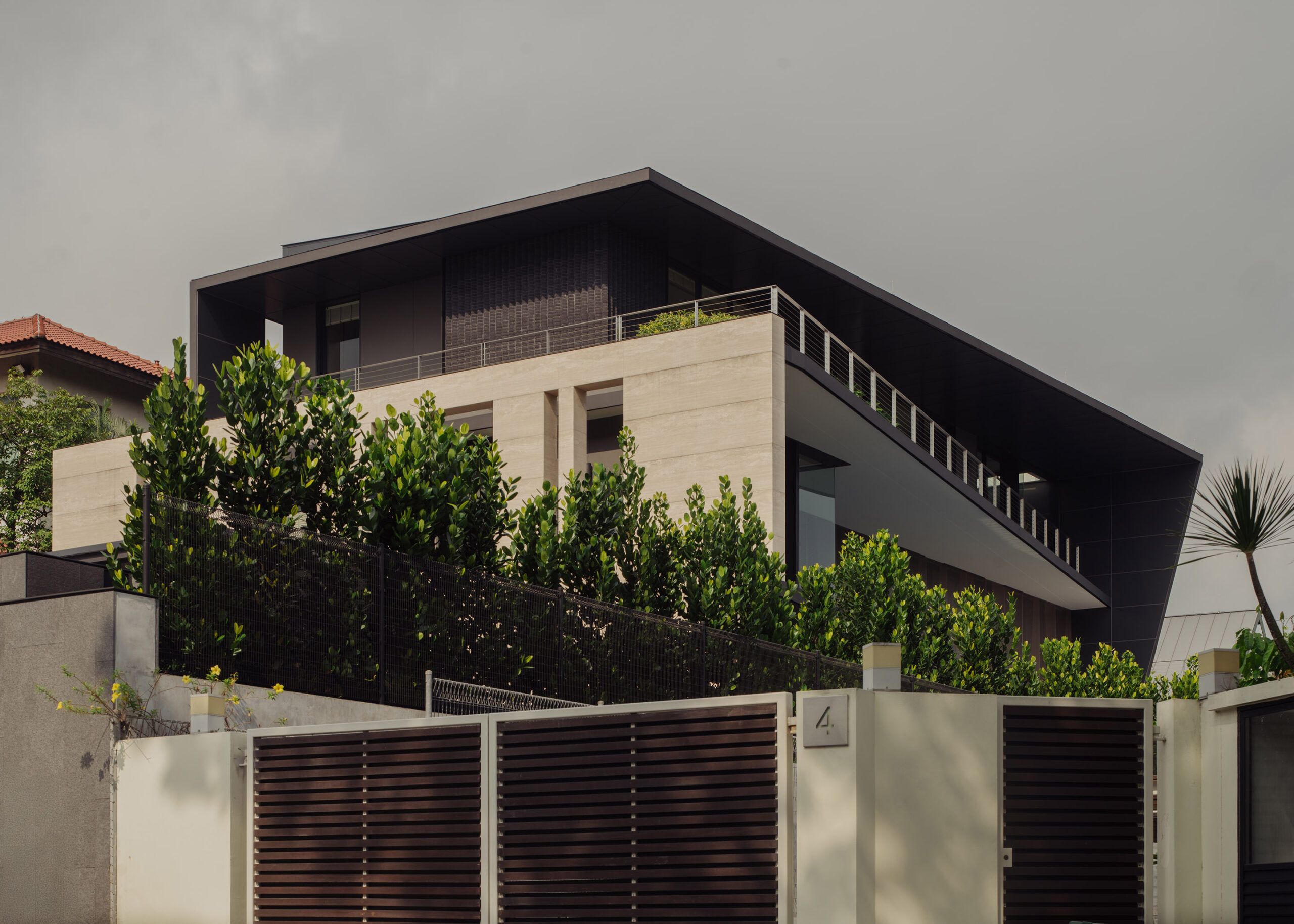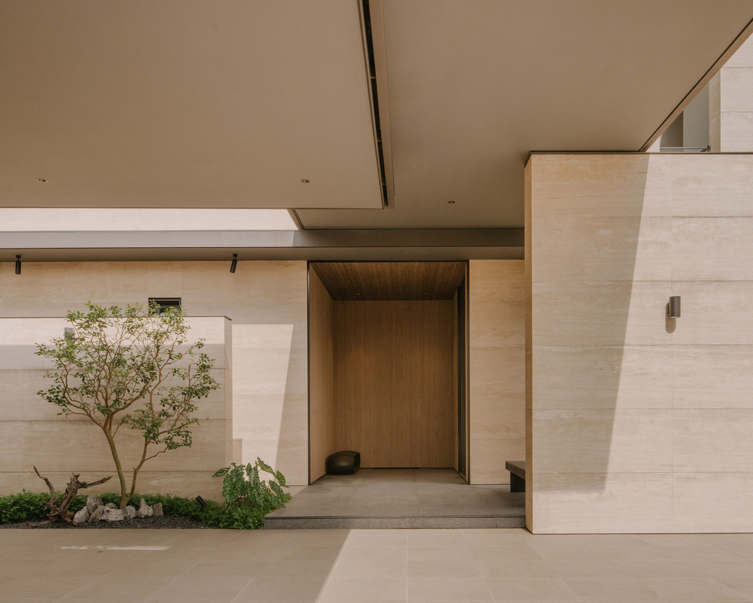 A key feature of the design is the dynamic slanted roof that descends seamlessly to form the back wall of the house. This continuous gesture unites roof and façade, creating a sense of movement and sculptural clarity. The slant draws the eye toward the main opening, where light and shadow shift throughout the day, reinforcing the home’s balance between protection and openness.
