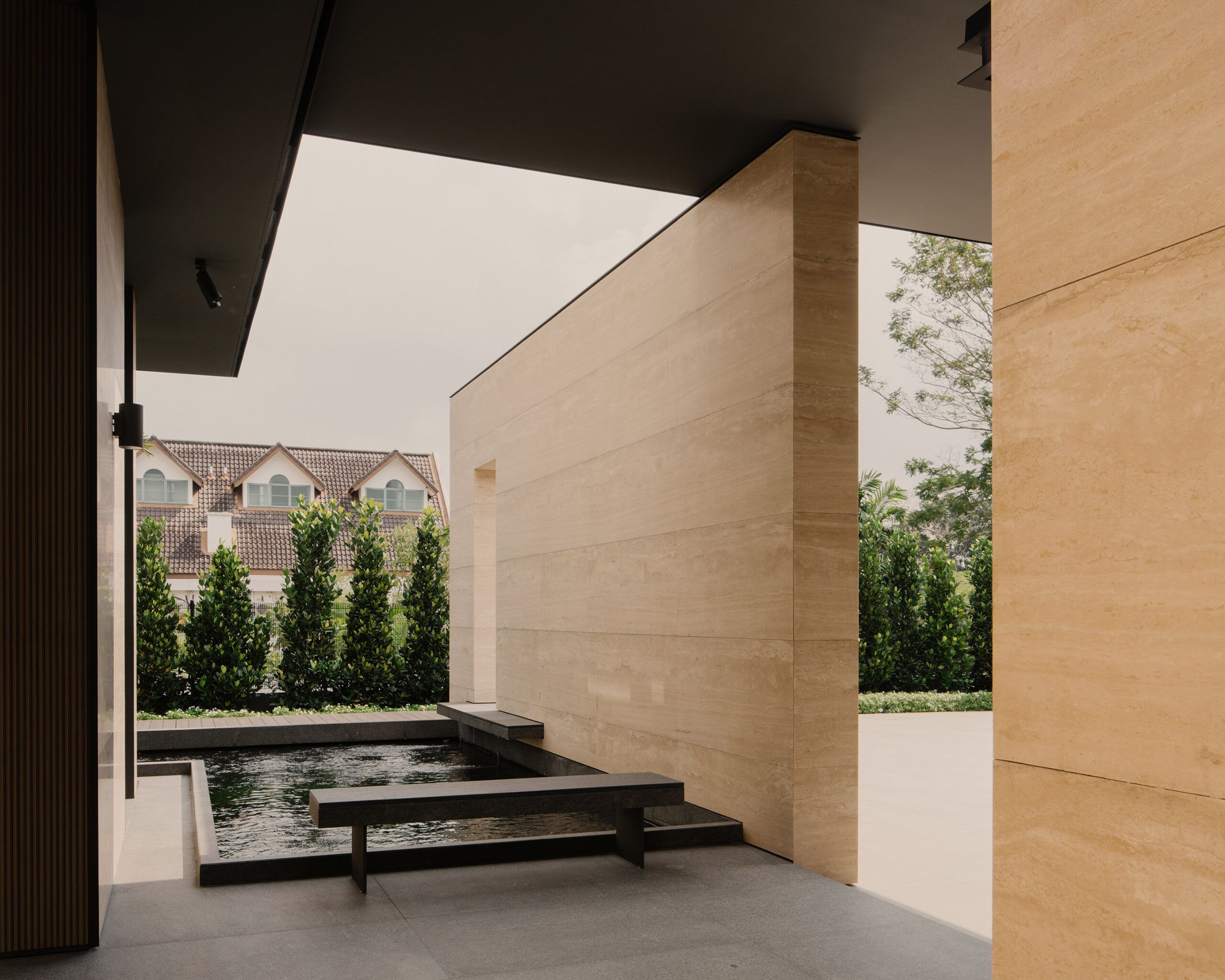 At the rear, the dining pavilion extends this language with a mirrored slanted roof that opens toward the garden and pool. Together, the two planes establish a subtle architectural dialogue — framing views, drawing light, and tying the composition together through rhythm and symmetry.